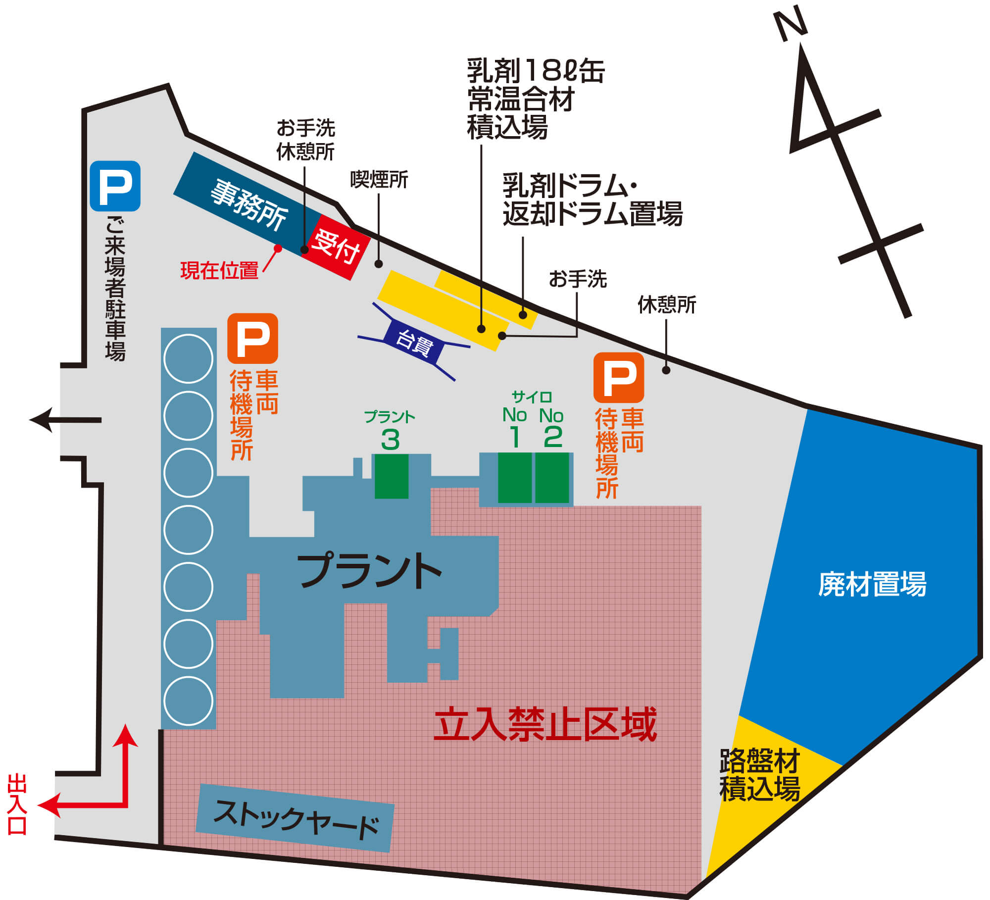 | 製造品目 | 新規合材:粗粒、密粒、細粒、開粒、改質Ⅱ型合材、改質H型合材など 再生合材:再生粗粒、再生密粒、再生細粒など |
